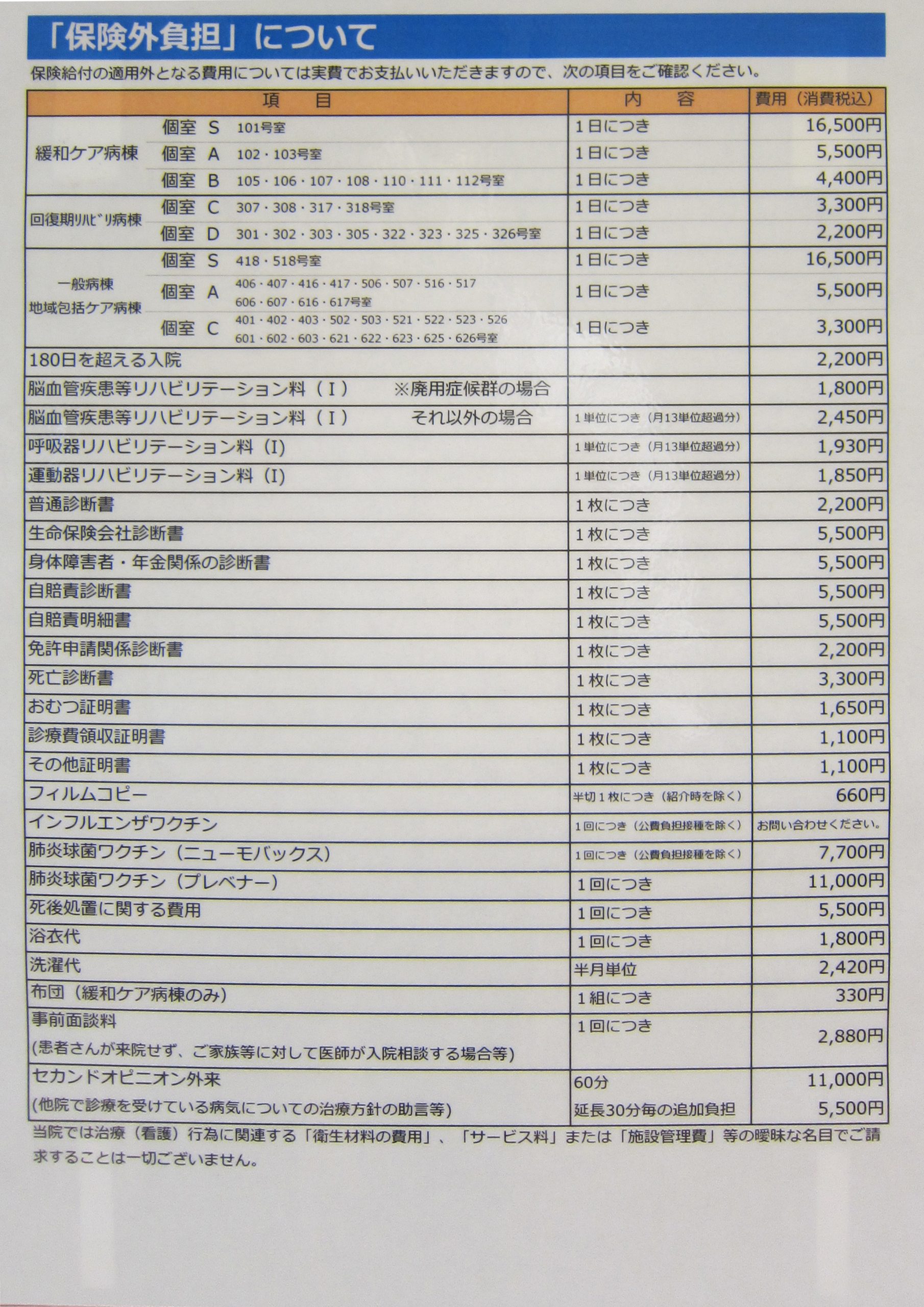 ●保険適用外(実費負担)の費用は次の通りです。